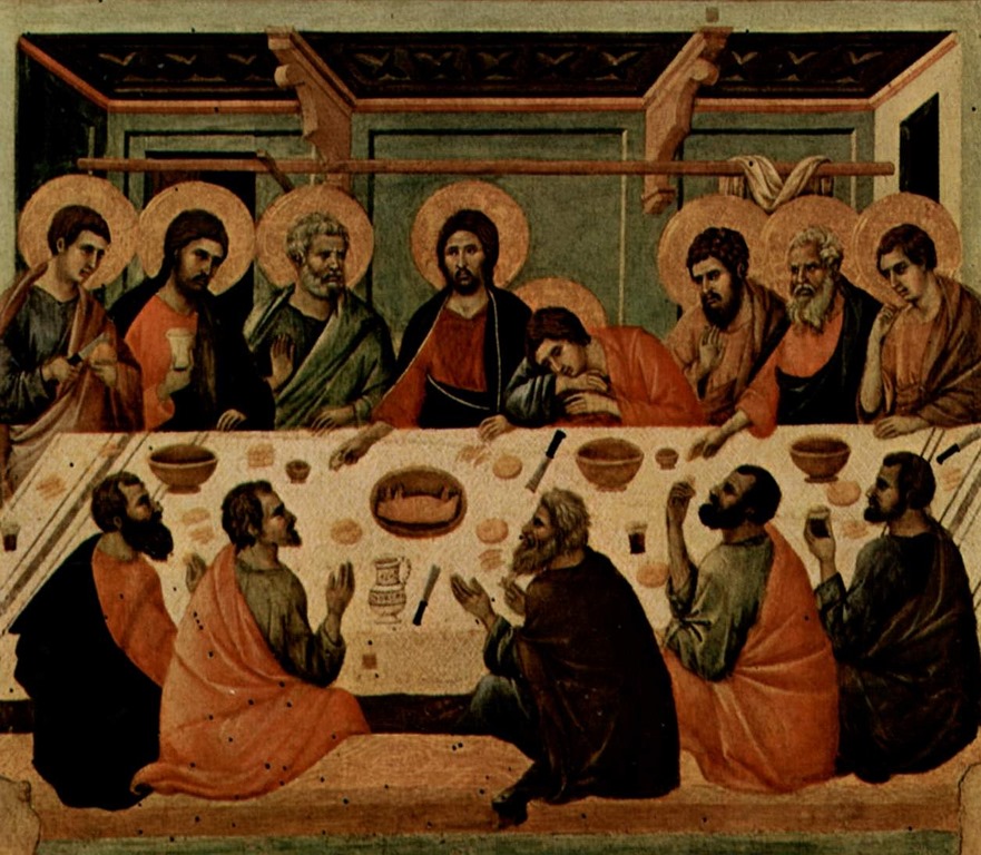 Then there is the wonderful depiction of the Last Supper by Duccio di Buoninsegna (1235-1319) dated 1308-1312. Duccio avoids the problem of the haloes by only placing them behind frontal figures.