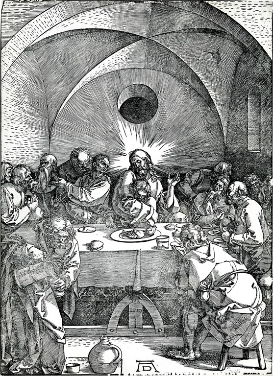 Albrecht Dürer (1471-1528) for instance emphasized the Eucharistic moment in his 1523 woodcut, shown here.